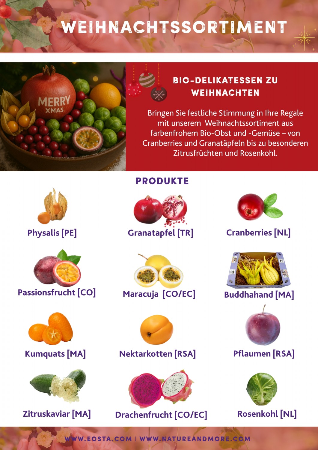Bringen Sie mit der speziellen Weihnachtsauswahl von Eosta zusätzliche Festtagsstimmung in Ihr Regal – ein farbenfrohes Sortiment an Bio-Obst und -Gemüse voller Geschmack und Ausstrahlung.