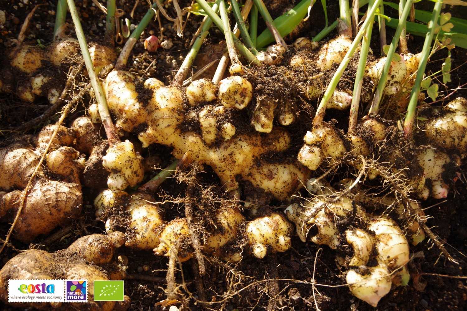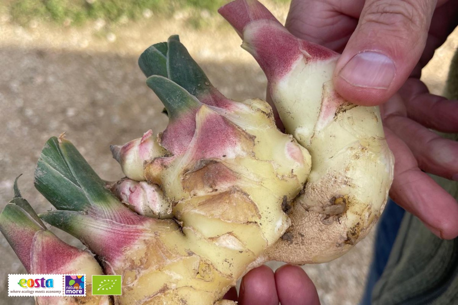 Der Ingwer dieses Jahres wird als frischer Ingwer angeboten. Mit diesem europäischen Versuchsanbau macht Eosta zusammen mit seinen Partnern einen Schritt in Richtung kürzerer Lieferketten und geringerer Abhängigkeit von Übersee-Anbaugebieten – ein wichtiges Thema für die Zukunft des Bio-Handels.